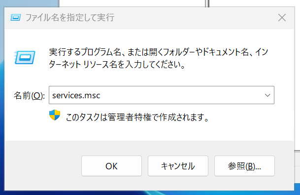 まずはWindowsキーとRキーを同時に押下してservices.mscと入力してEnterキーを押下します。