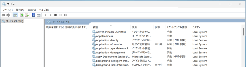 対象のサービスの状態が実行中から空欄に代わっていればサービスが停止しています。