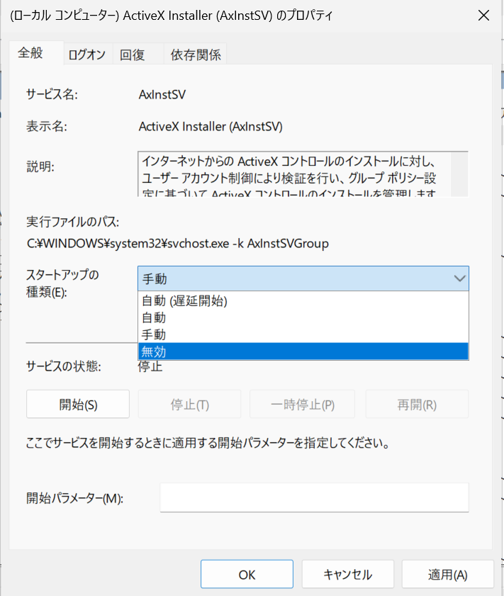 ActiveX インストーラー (AxInstSV)を無効にしてみます。