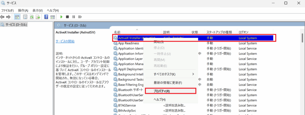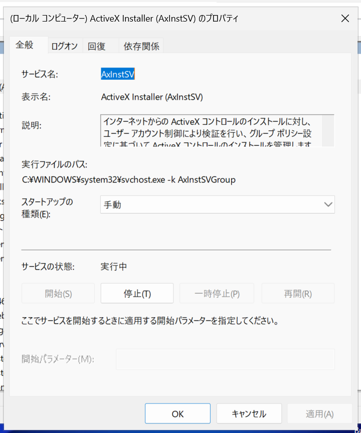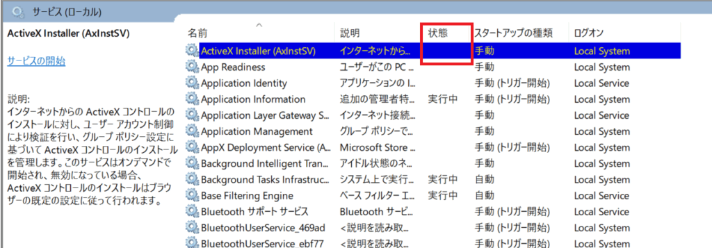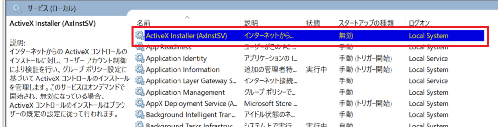 なお、デフォルトの状態でActiveX インストーラー (AxInstSV)は停止していたため、今回の記事作成に当たってあらかじめ開始しておきました。