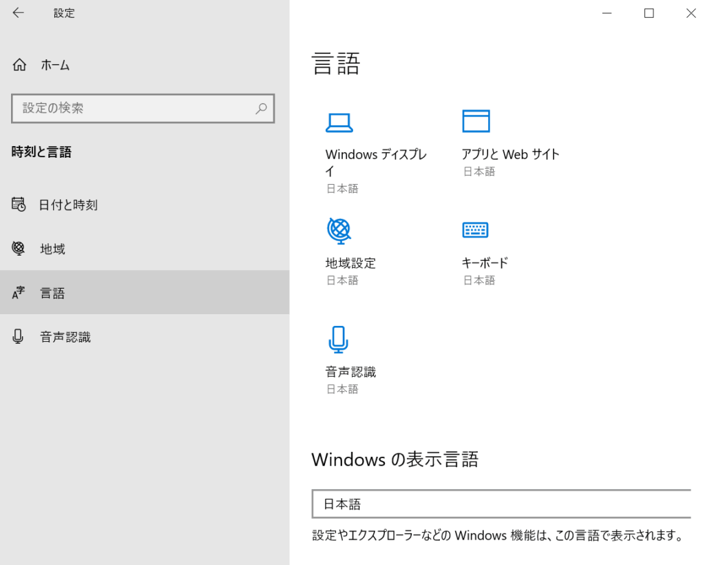 時刻と言語をクリックしたら、左ペインの言語をクリックします。