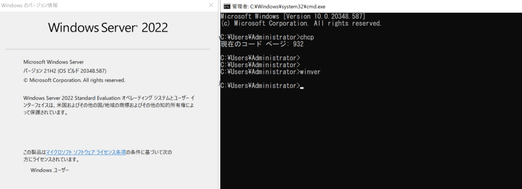 Windows Server 2022でコマンドプロンプトでchcpコマンドを実行した結果は以下です。