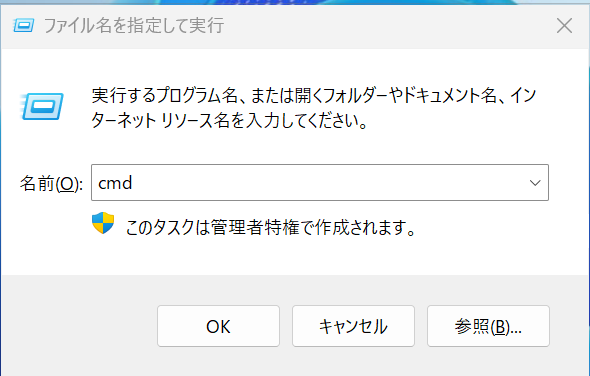 もしくは以下のようにWindowsキーとRキーを同時に押下し、その後cmdと入力してOKボタンを押下してもコマンドプロンプトを起動できます。