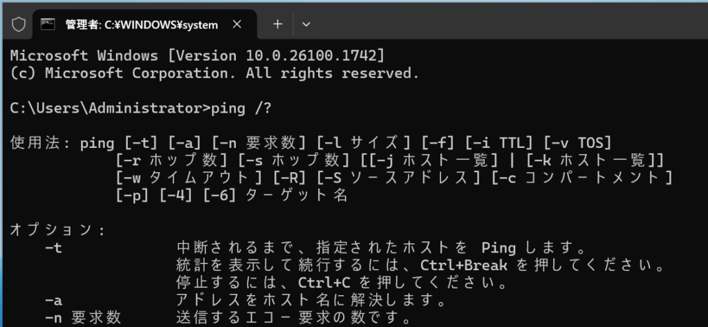 以下の画像はWindows Server 2025でping /?を実行した実行結果です。