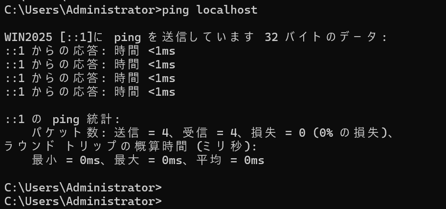以下はWindows Server 2025でコマンドプロンプトを起動して実行した実行例です。