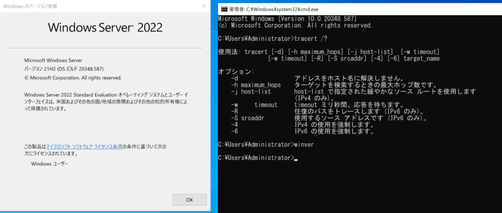以下はWindows Server 2022での「tracert /?」コマンドの実行結果です。