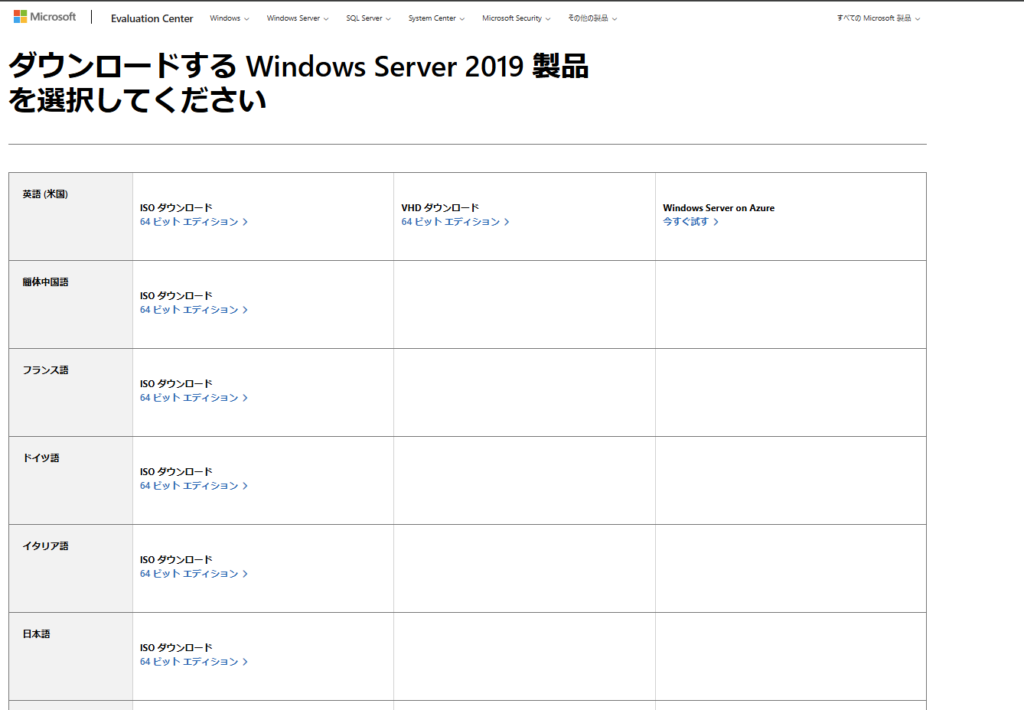 以下Microsoft公式サイトからWindows Server 2019をインストールするための.isoファイルをダウンロードします。