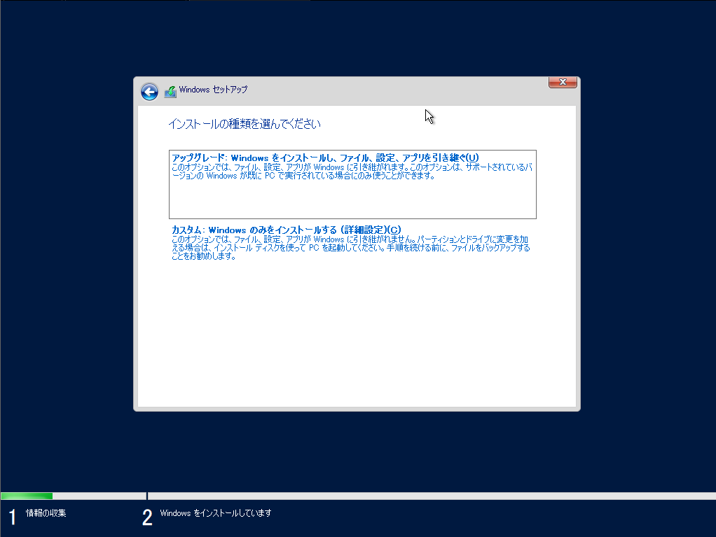 カスタム: Windowsのみをインストールする(詳細設定)(C)を選択します。