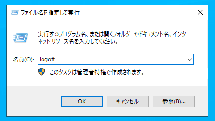 もしくは以下のようにWindowsキーとRキーを同時に押した後にlogoffと入力してエンターします。