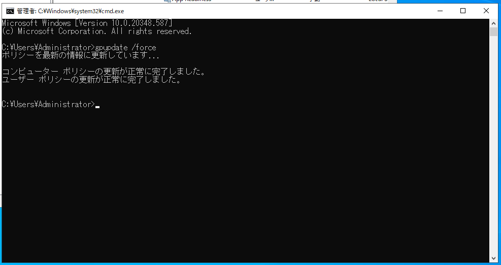 グループポリシーを変更したら以下のコマンドを実行して強制的にグループポリシーをWindows Server に適用します。