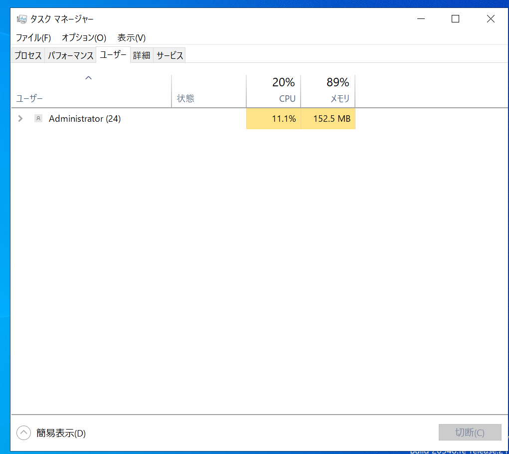 タスクマネージャーの「ユーザー」タブを開きます。ここにログインしているユーザーが表示されます。画像の例ではAdministratorのみがログインしています。