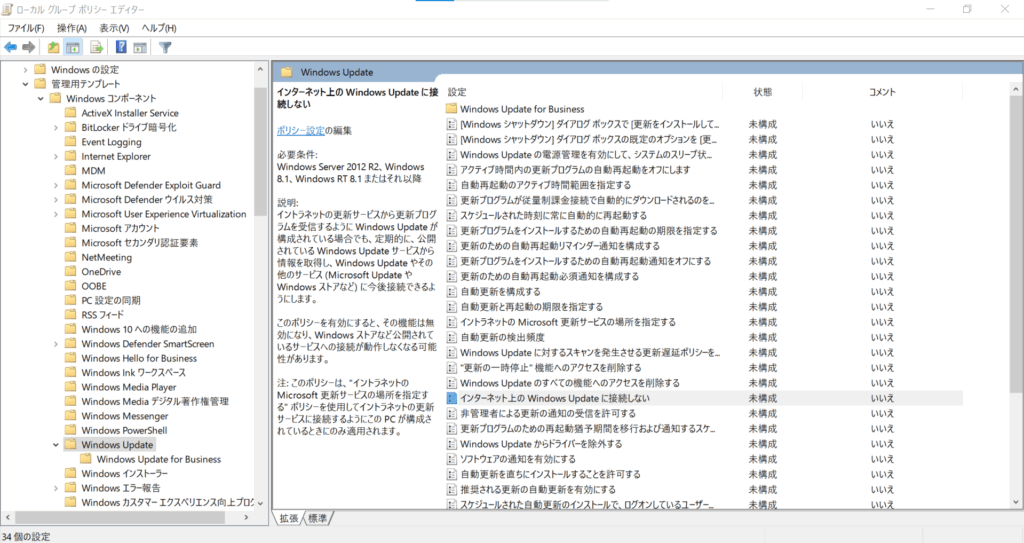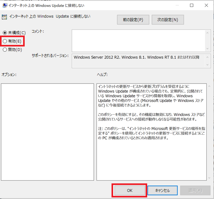 有効化するには、「ローカル コンピュータ ポリシー>コンピュータの構成>管理用テンプレート>Windows コンポーネント>Windows Update」から「インターネット上のWindws Updateに接続しない」をダブルクリックして有効(E)を選択してOKボタンを押下します。