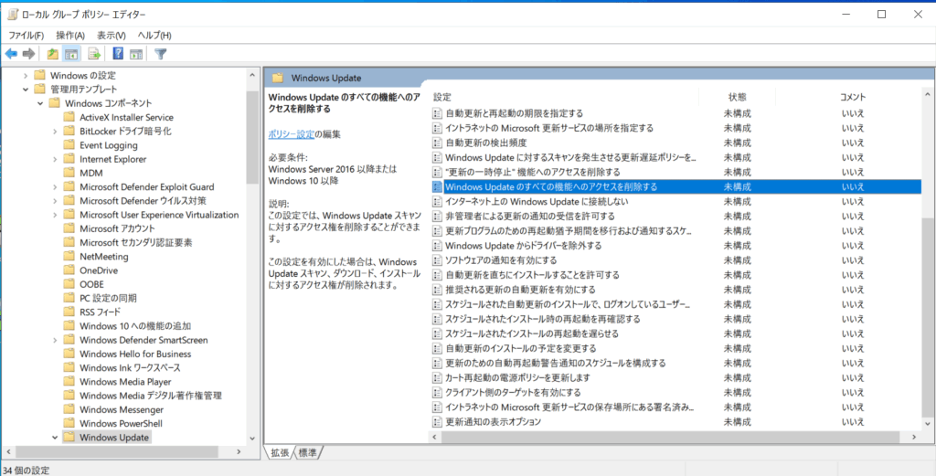 - Windows Update のすべての機能へのアクセス権を削除する(有効)