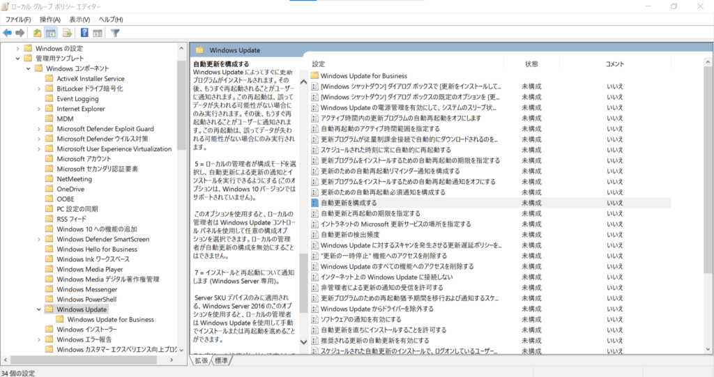 ローカル コンピュータ ポリシー>コンピュータの構成>管理用テンプレート>Windows コンポーネント>Windows Updateの以下グループポリシーを設定します。