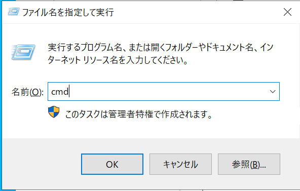コマンドプロンプトの起動は、Windows キーとRキーを同時に押してcmdと入力してEnterキーを押下します。