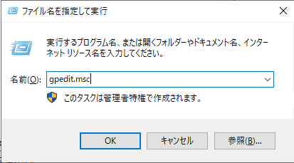 WindowsキーとRキーを同時に押して以下のウィンドウを立ち上げて「gpedit.msc」と入力し、エンターキーを押します。