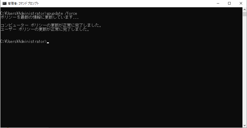 gpupdate /forceコマンドをコマンドプロンプトで実行することで再起動せずに最新のグループポリシーを適用することができます。