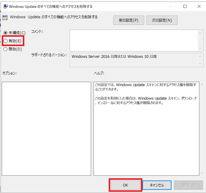 有効化するには、「ローカル コンピュータ ポリシー>コンピュータの構成>管理用テンプレート>Windows コンポーネント>Windows Update」から「Windows Update のすべての機能へのアクセスを削除する」をダブルクリックして有効(E)を選択してOKボタンを押下します。