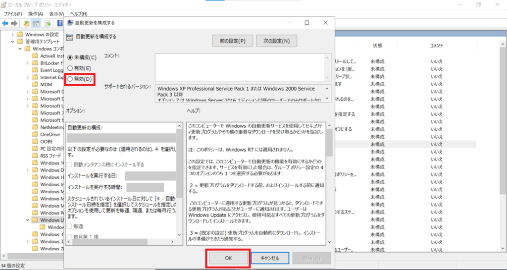 無効化するには、「ローカル コンピュータ ポリシー>コンピュータの構成>管理用テンプレート>Windows コンポーネント>Windows Update」から「自動更新を構成する」をダブルクリックして無効(D)を選択してOKボタンを押下します。