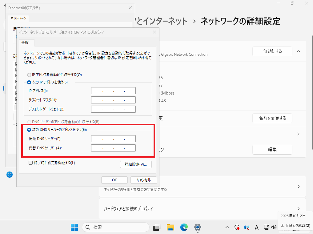接続するDNSサーバーのIPアドレスを設定します。IPv4アドレスを設定したときに開いたウィンドウを開き、下部の「次のDNSサーバーのアドレスを使う」にDNSサーバーのIPアドレスを入力します。