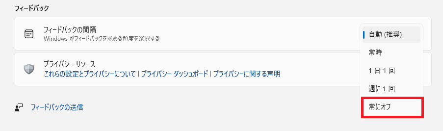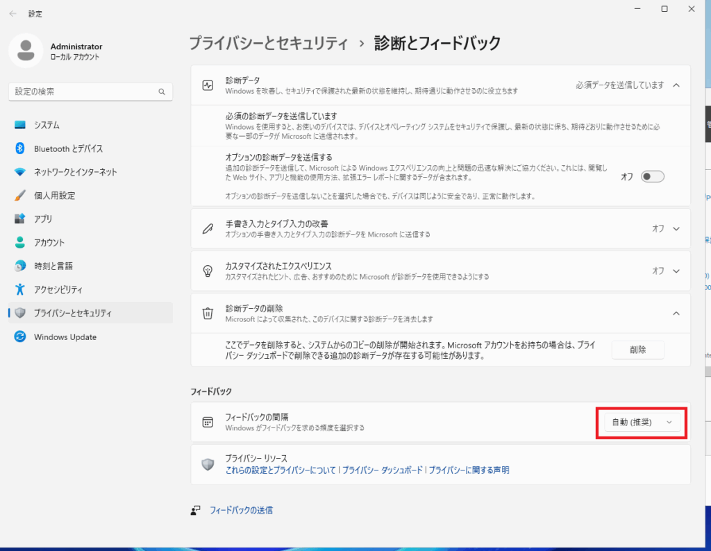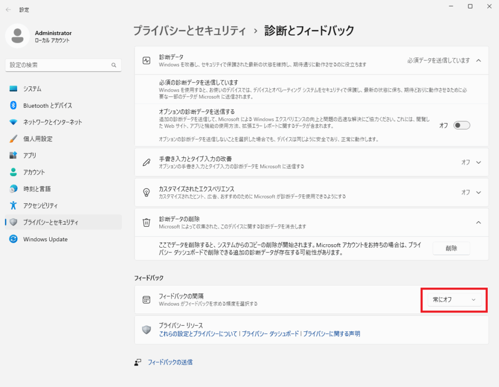 「診断とフィードバック」が送信されないようになっていることを確認する
