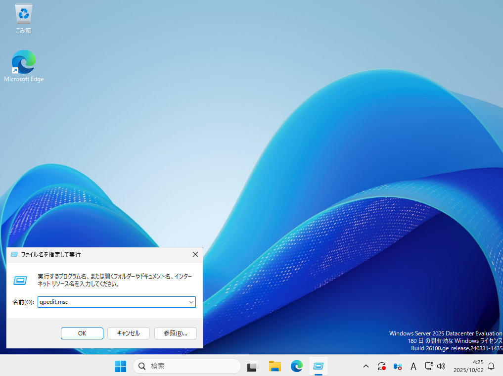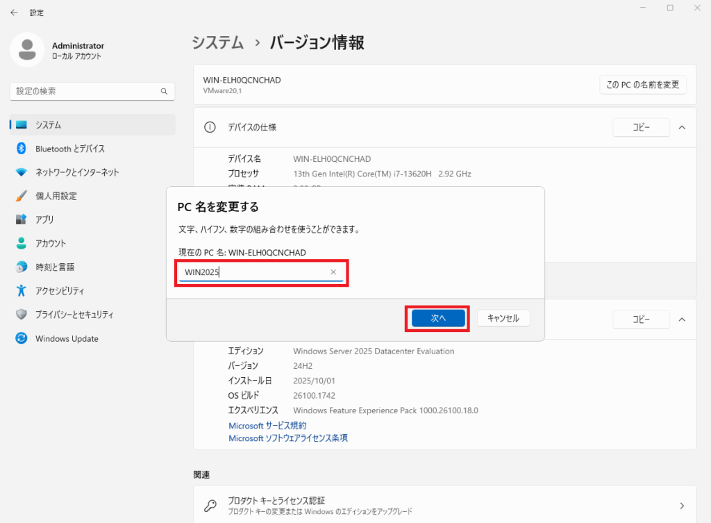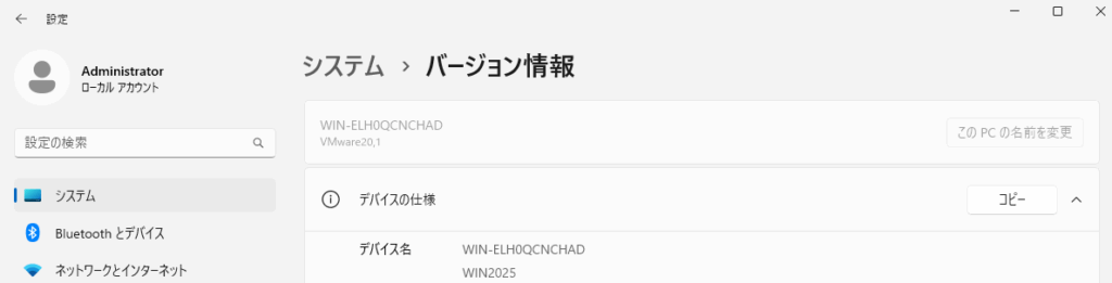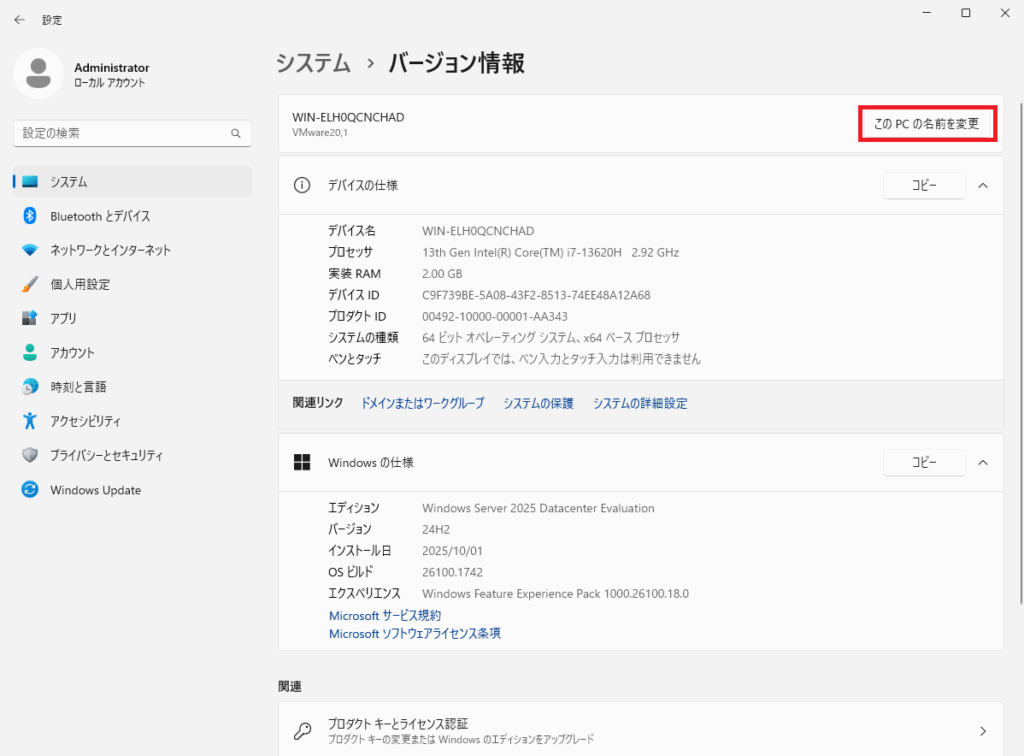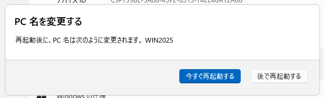 ※この作業を行うには、前述のコンピュータ名変更時にコンピュータ名を変更した後再起動して設定がWindows Server 2025に既に反映されている状態である必要があります。