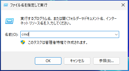 Windows キーとRキーを同時に押してcmdと入力してOKボタンを押下しコマンドプロンプトを起動します。