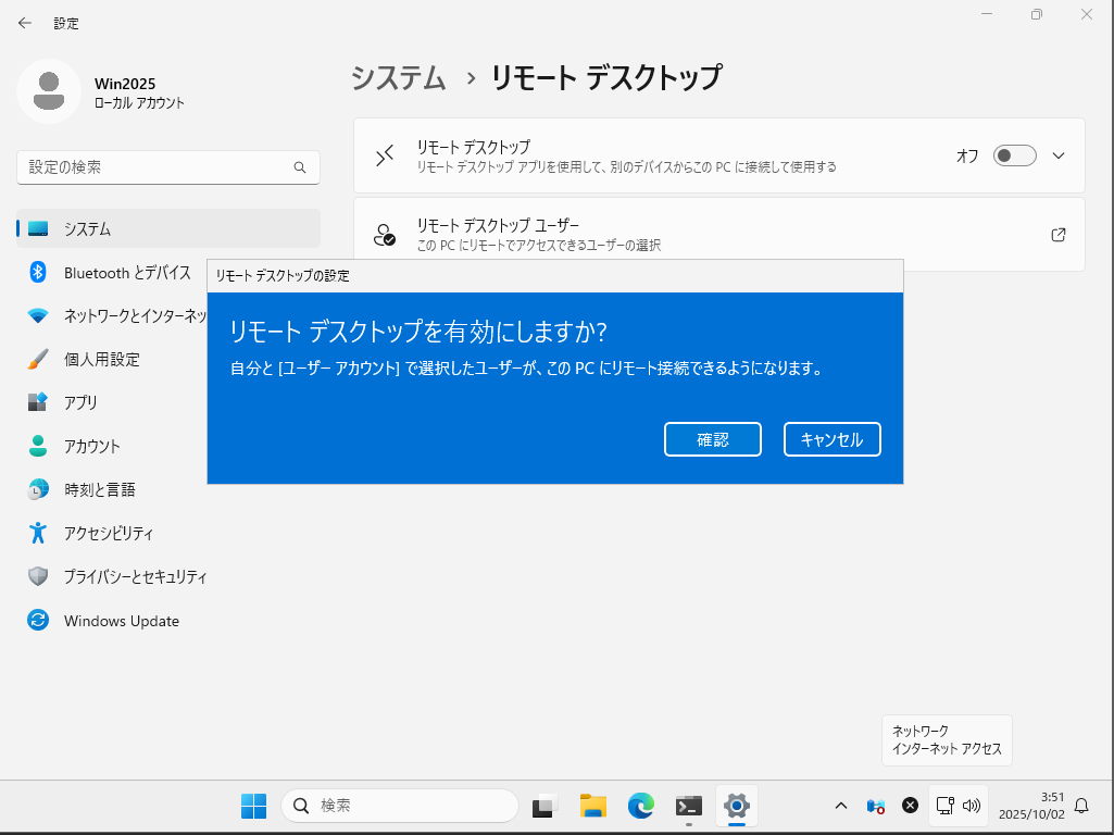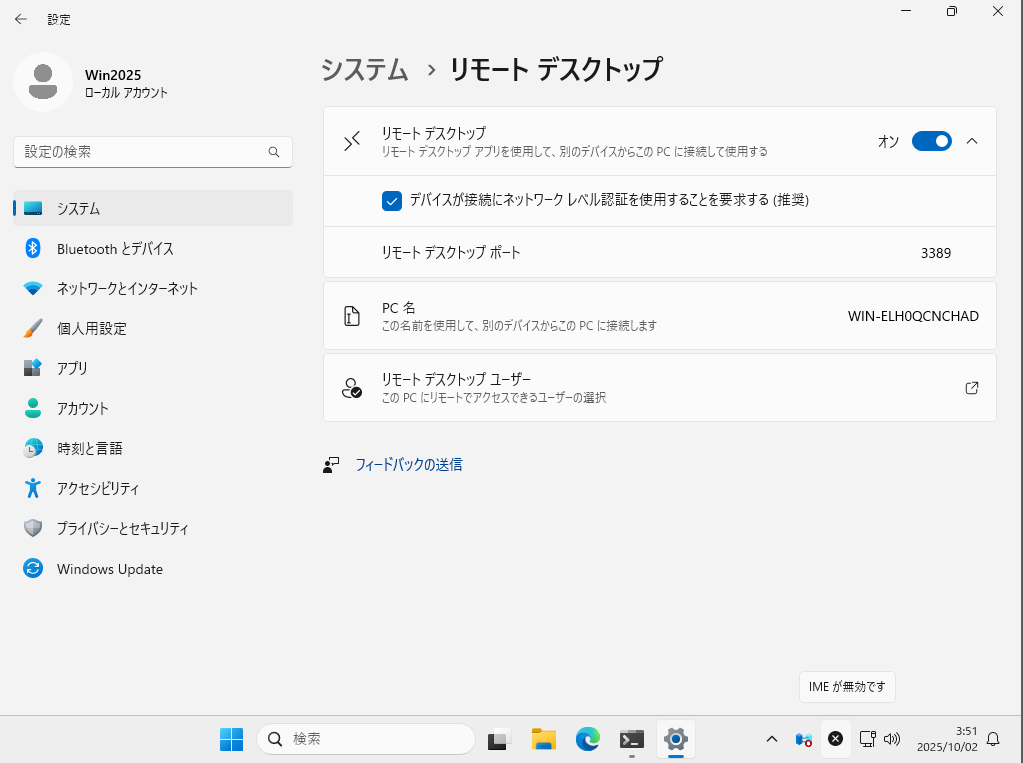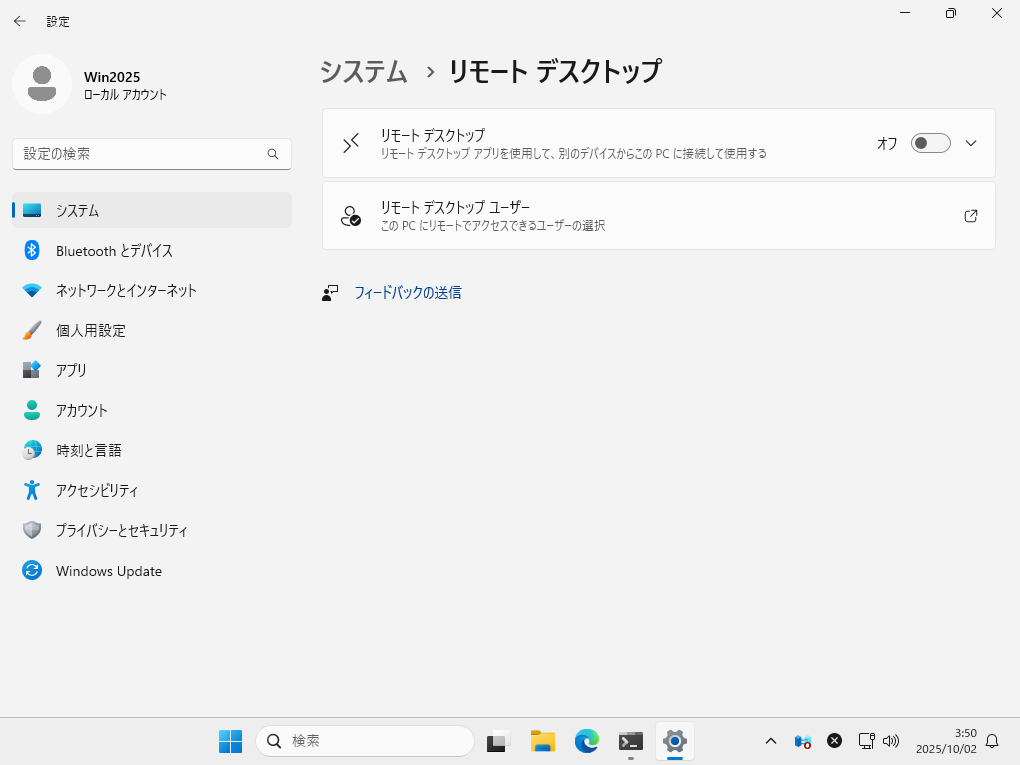 Windows Server 2025はデフォルトではリモート接続がオフになっていたため、リモート デスクトップを有効にします。