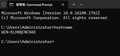 コマンドプロンプトでも同じく再起動を実施していないと変更前のコンピュータ名が出力されます。