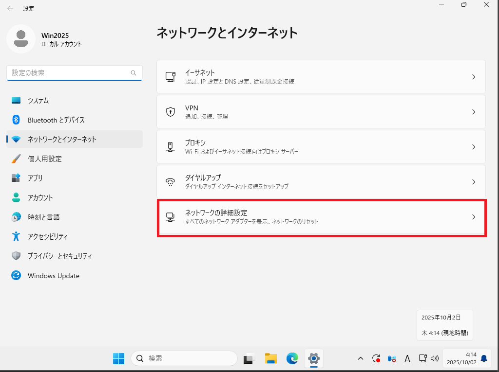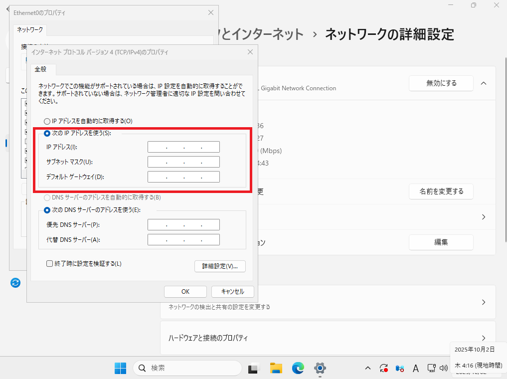 ホスト(ノード、今回のWindows Server 2025そのもの)にIPアドレスを設定する