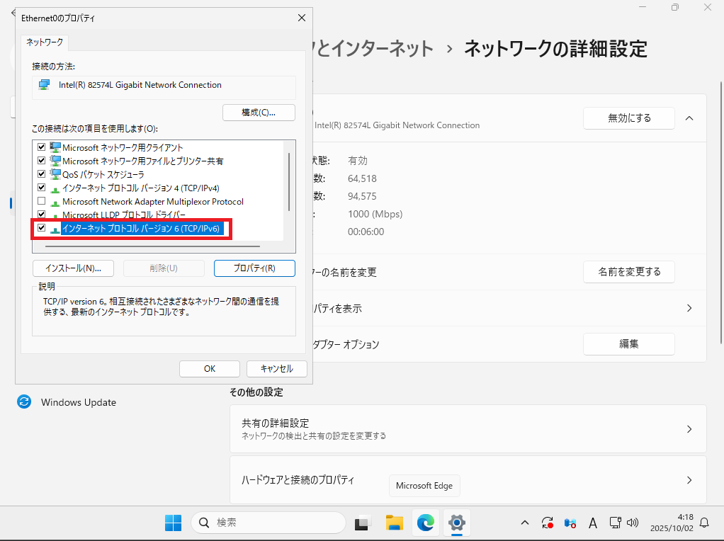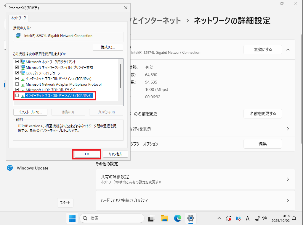デフォルトでは「インターネットプロトコルバージョン6(TCP/IPv6)にチェックが入っています。このチェックを外してOKボタンを押下してウィンドウを閉じます。