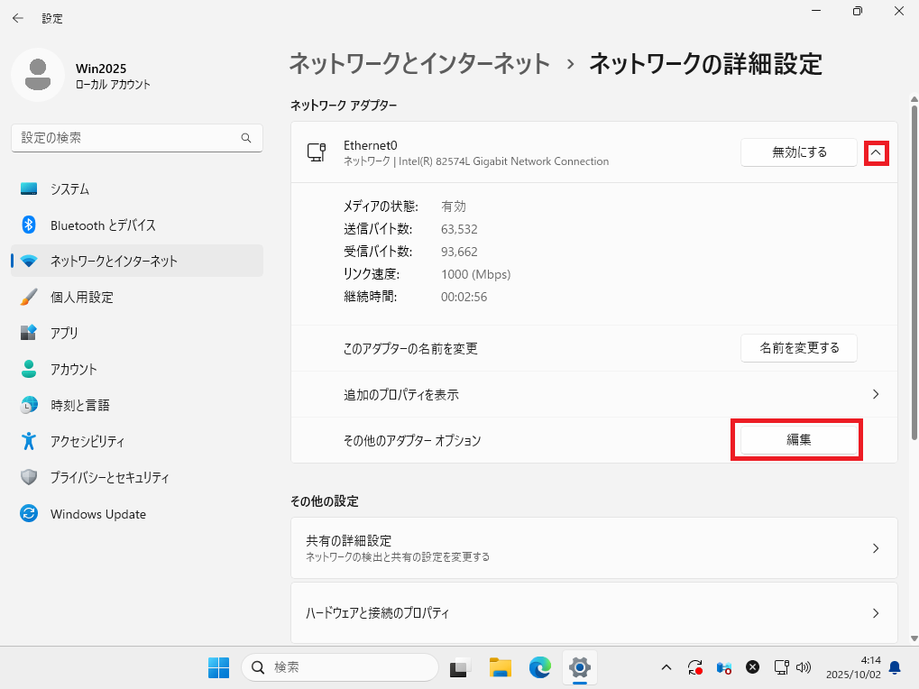 タブを展開して「その他のアダプターオプション」の「編集」をクリックします。