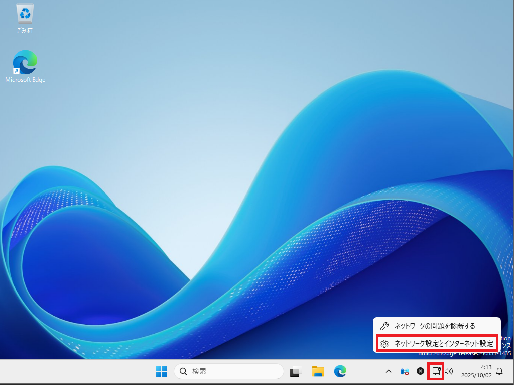 まずは右下のネットワークに関するアイコンをクリックして「ネットワーク設定とインターネット設定」をクリックします。