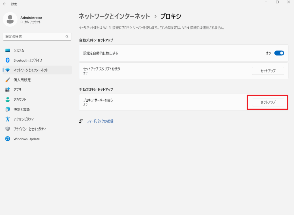 設定の左ペイン「ネットワークとインターネット」から「プロキシ」を選択し、以下の画面の「プロキシーサーバーを使う」のセットアップボタンをクリックします。