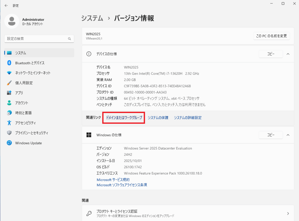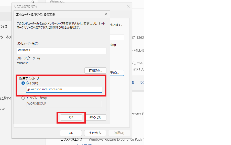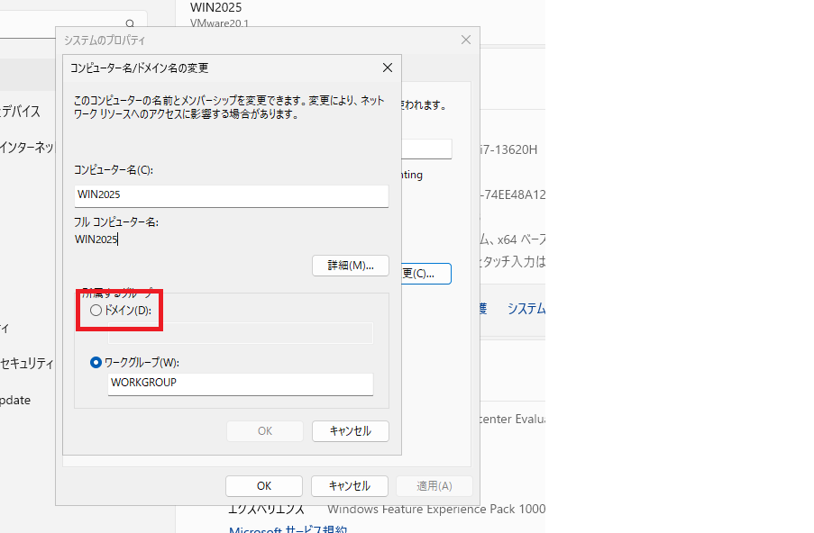 Windows Server 2025で構築するサーバーをWindows ドメインに参加させます。