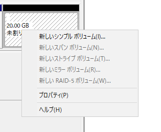 未割り当ての部分を右クリックして「新しいシンプル ボリューム」をクリックします。