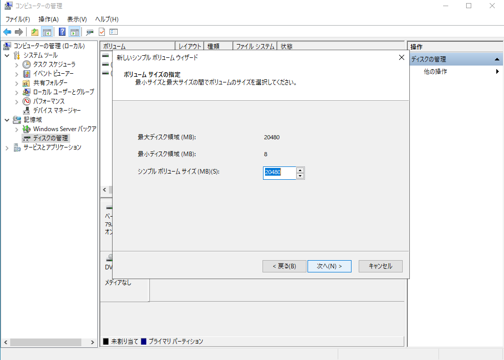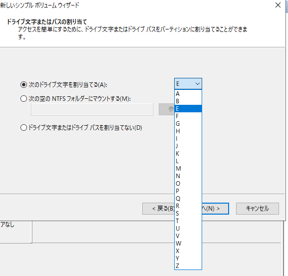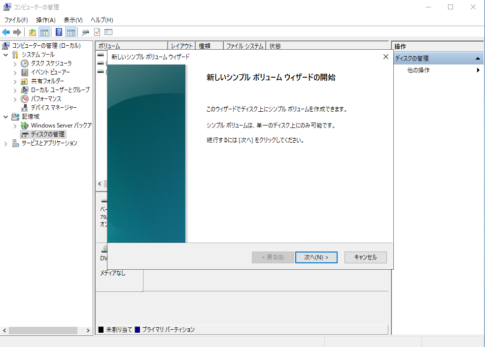 未割当になっているので、これを割り当てていきます。ただし、このやり方で割り当てると、Cドライブを拡張する形ではなくて、新しくドライブを追加することになります。ディスクを拡張するには「正常(回復パーティション)」を一度削除してから拡張する必要があります。
