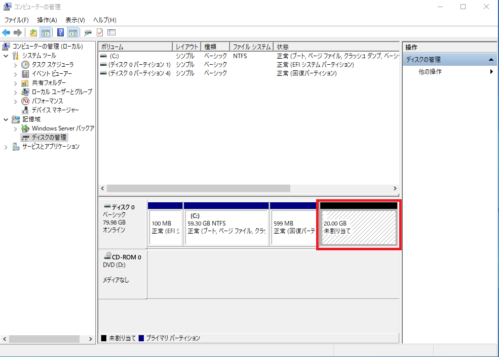 回復パーティションがこれで削除され、未割り当ての状態になりました。