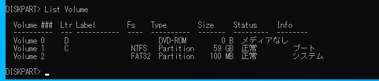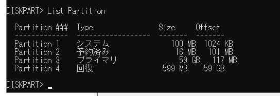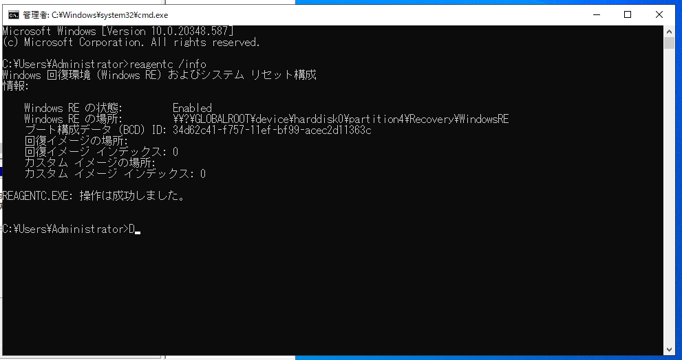 コマンドプロンプトを起動したら以下のコマンドで回復パーティションの状態を確認します。