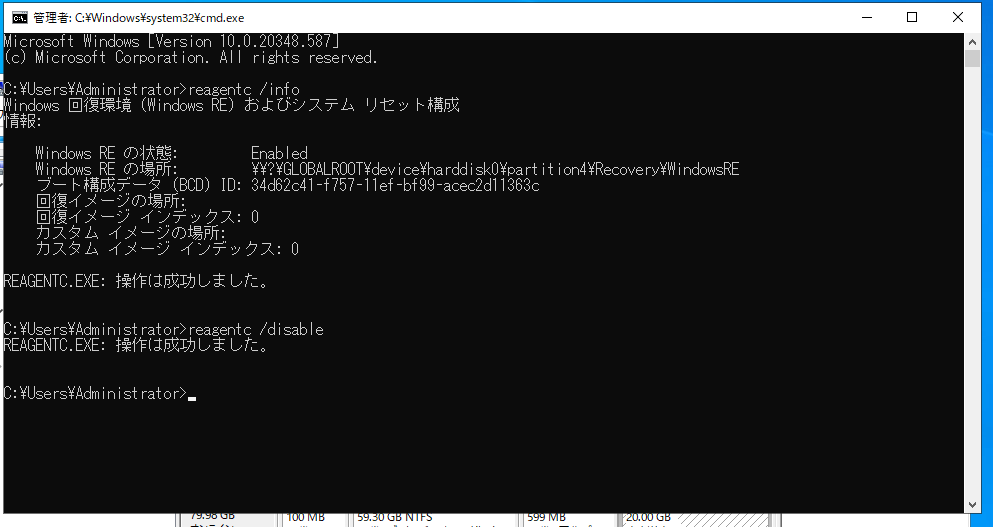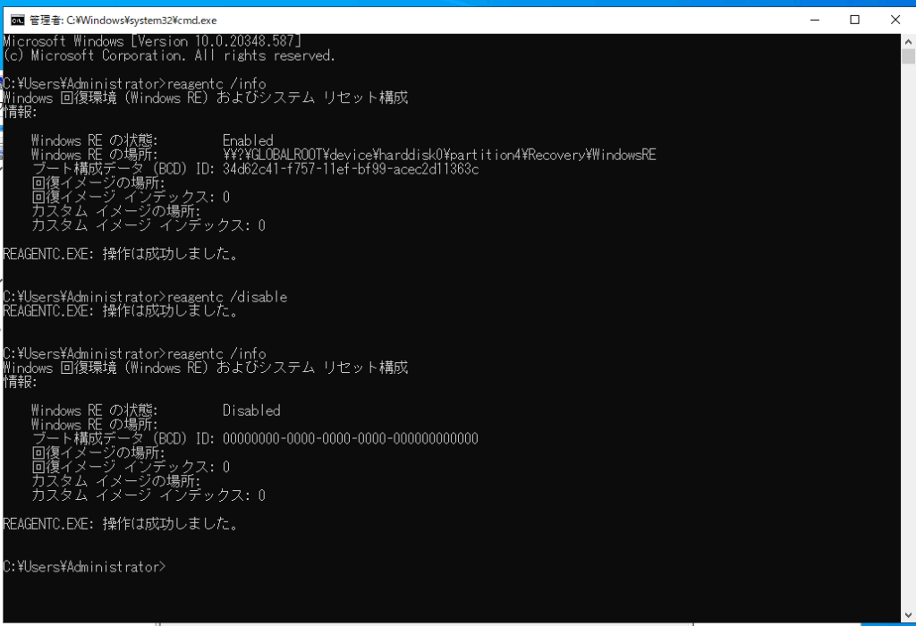 Windows RE の状態:がEnabledに、つまり有効になっているので、これを無効化させていきます。