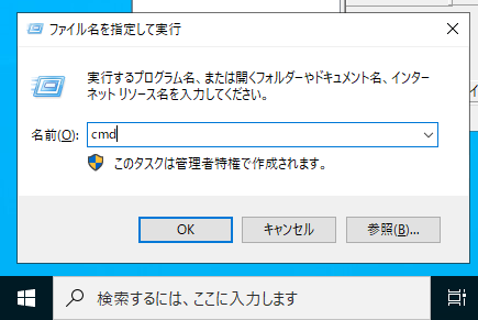 WindowsキーとRキーを同時に押してcmdと入力します。