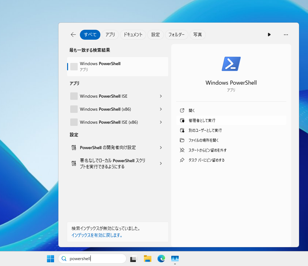 まずは管理者実行でPowershellを開き、以下のコマンドを実行します。
