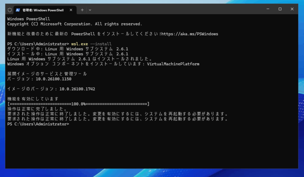 これでWindows Server 2025にWSLのインストールが完了しました。