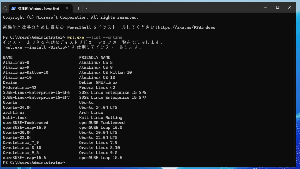 以下のコマンドをWindows Server 2025上のPowershellで実行して、インストールが可能なLinuxを確認します。
