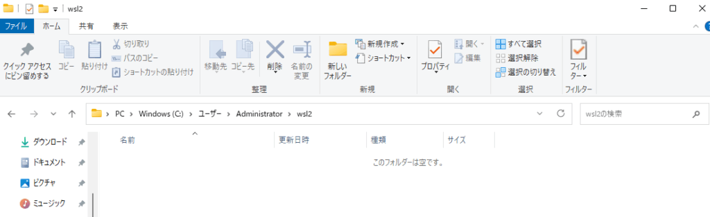 今回はadministratorユーザーのフォルダ配下にwsl2フォルダを作成して、次のコマンドを実行します。