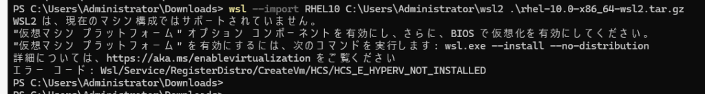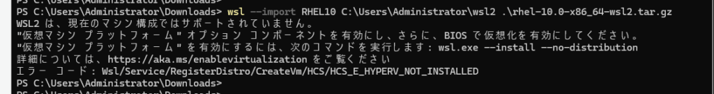 PS C:\Users\Administrator\Downloads> wsl --import RHEL10 C:\Users\Administrator\wsl2 .\rhel-10.0-x86_64-wsl2.tar.gz