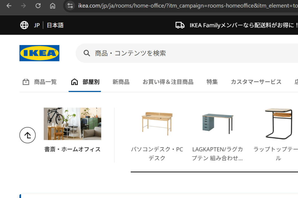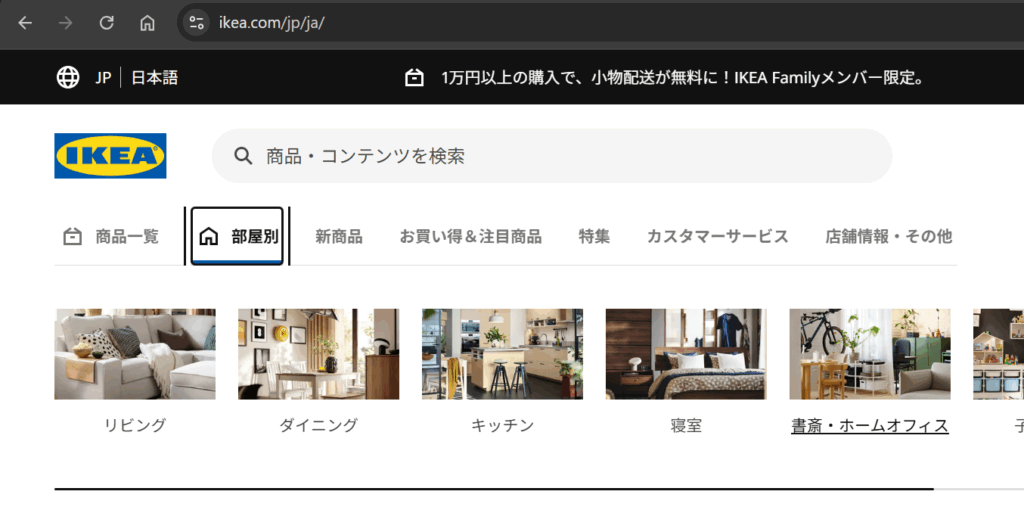 IKEAのオフィスや自宅書斎等に設置するデスクを探すには、IKEAトップページへアクセスし、部屋別から書斎・ホームオフィスをクリックします。