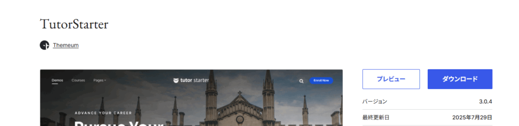 TutorLMSに対応しているテーマ、TutorStarterのインストールは、以下の公式サイトからダウンロードボタンを押下してzipファイルをダウンロードしてからそのファイルをWordPressにあてがう形でインストールしました。