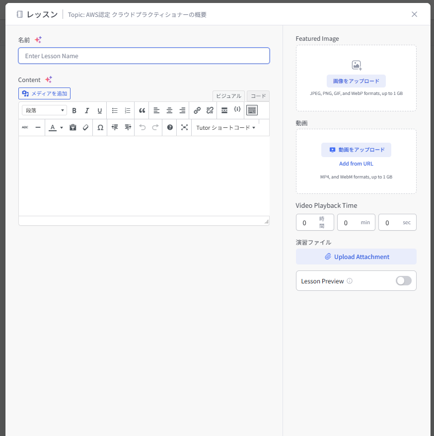 コースの管理画面やボタンなど、TutorLMSの一部のUIについては翻訳が終わっておらず英語のままになっています。