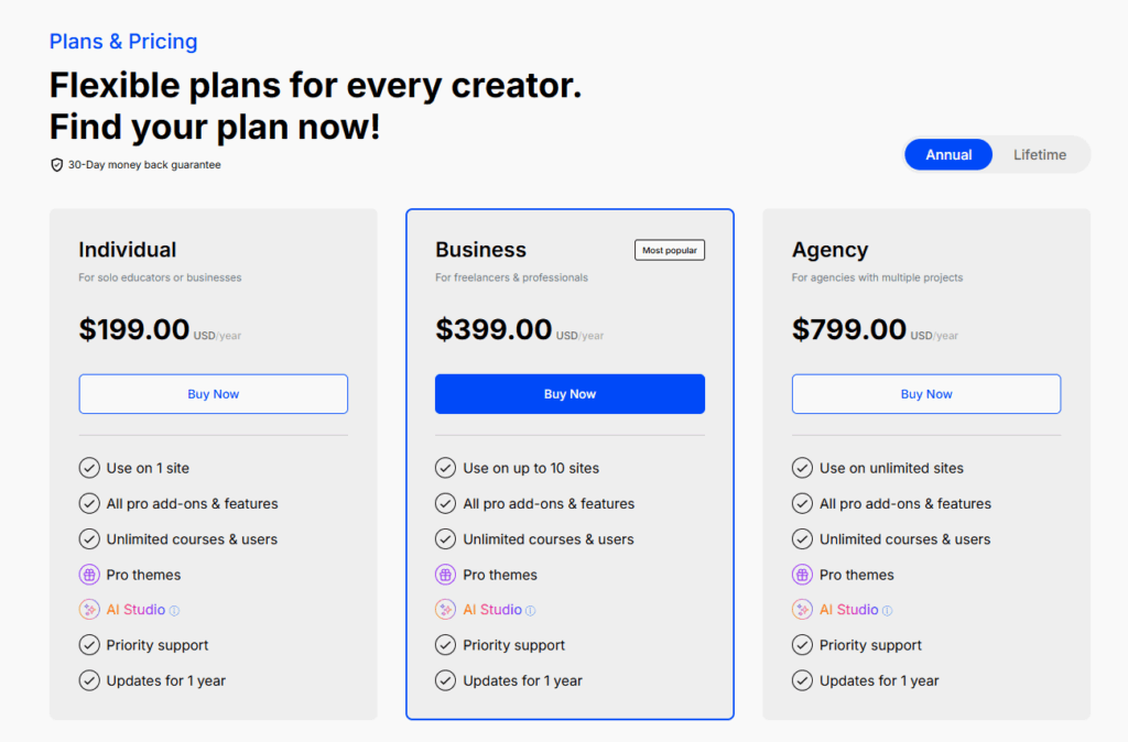 そもそも学習用サイトの構築に使われるプラグインにはtutorLMS以外にもいくつか候補があったため、もし使いにくいなどのことがあった際に他のサービスへ移行できるよう、Individualでのライセンス購入にしました。取り急ぎ試したいという意図があるので、Annual(年間払い)での購入をしています。